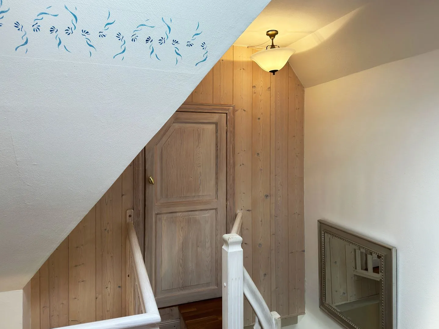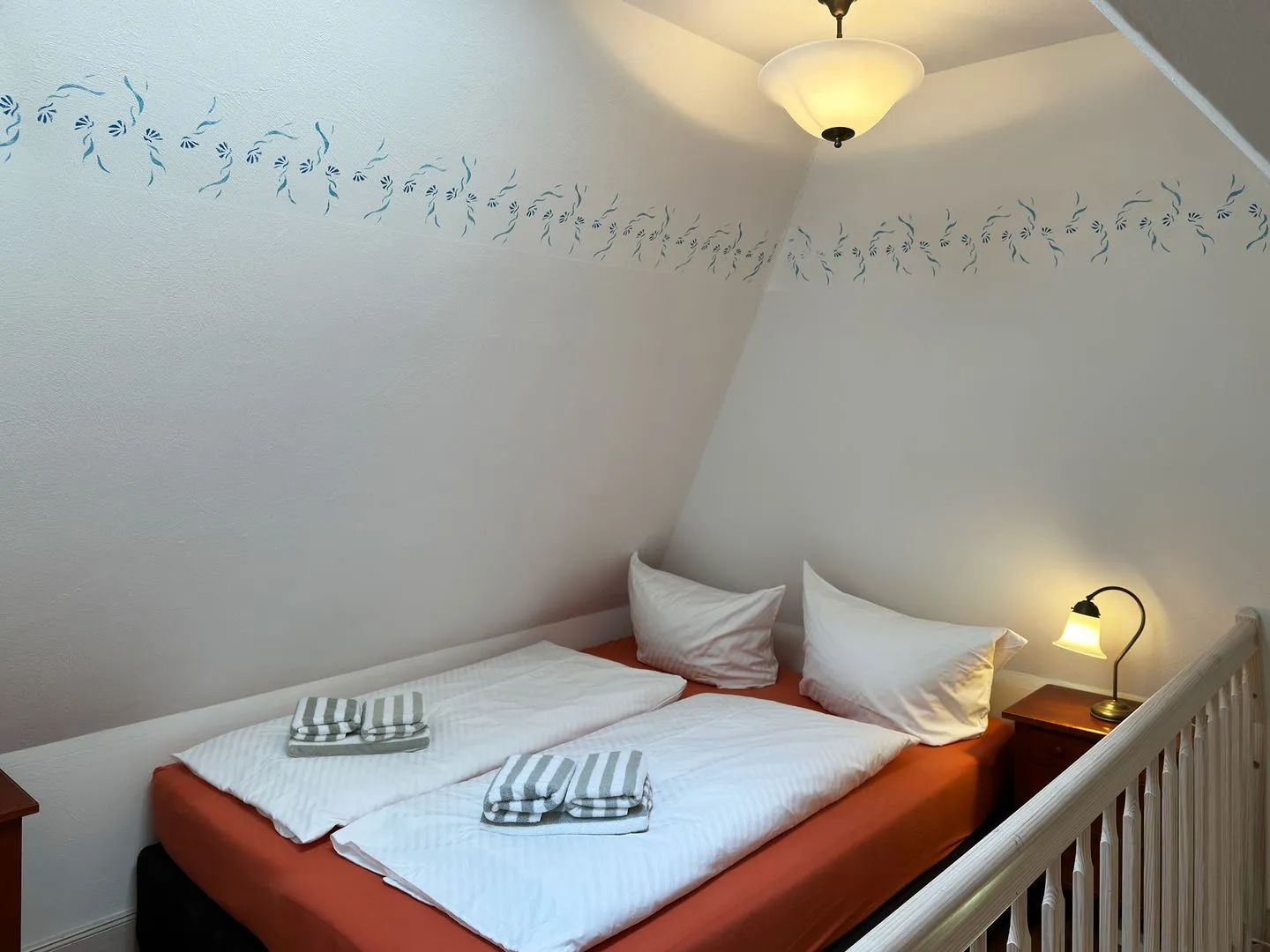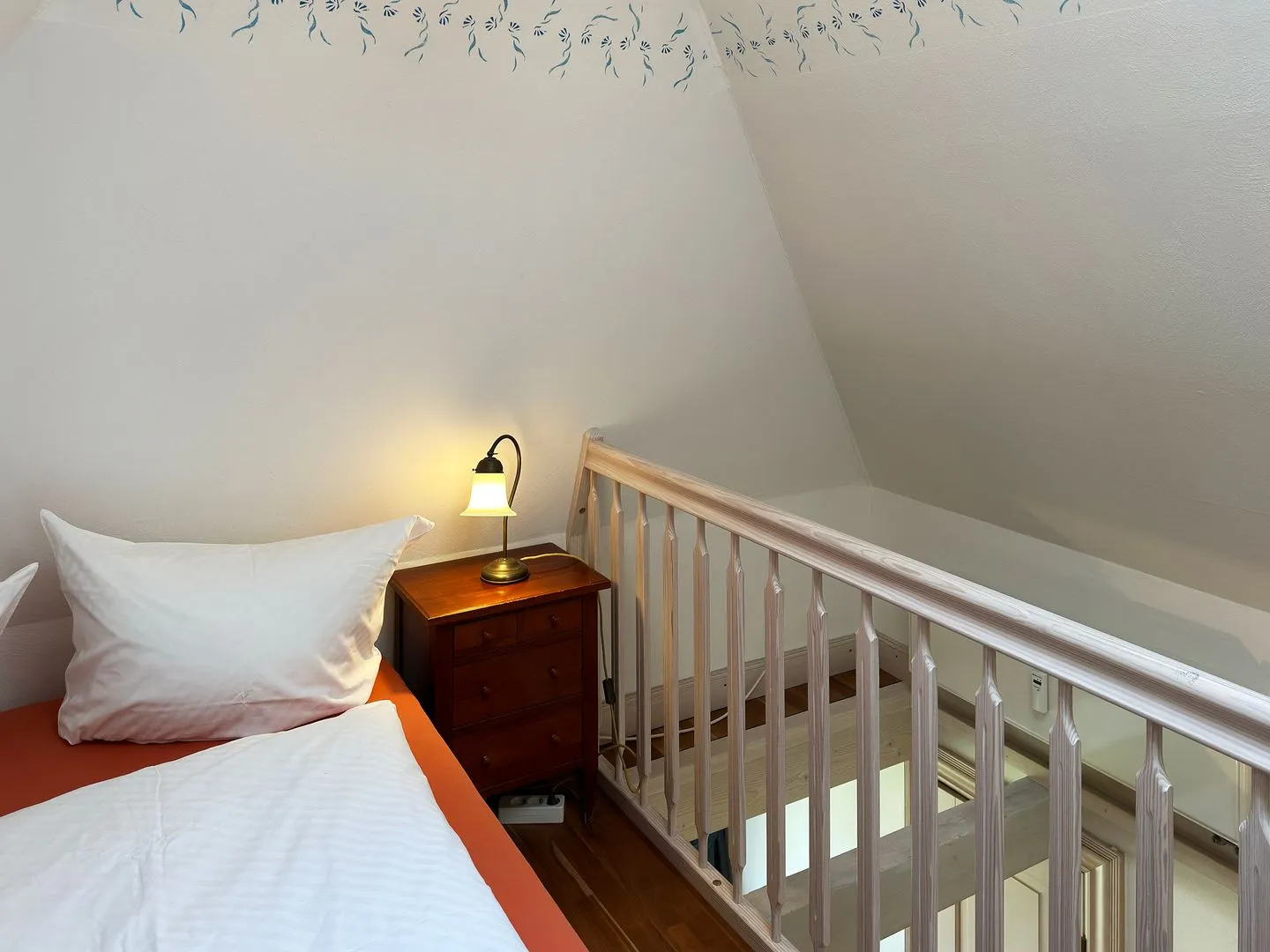 Offene Schlafgalerie mit Doppelbett (2x80x200), Oberlicht und begehbarem Kleiderschrank im Spitzboden.