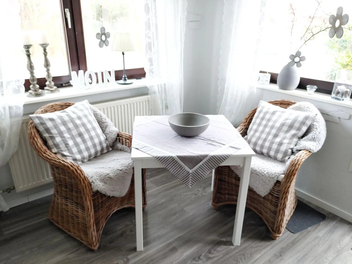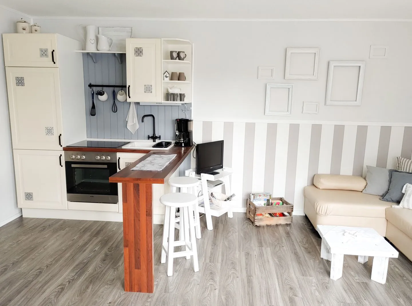 Die Wohnung verfügt über einen Wohnraum mit Sat-TV und offener kleiner Küche mit Frühstückstresen, ein kleines Schlafzimmer, ein Badezimmer mit Dusche und WC. Vor dem eigenen Eingang ist eine kleine Außen-Sitzmöglichkeit. Hinweis: das Doppelbett im Schlafraum befindet sich in einer Nische und ist nur einseitig zu besteigen.