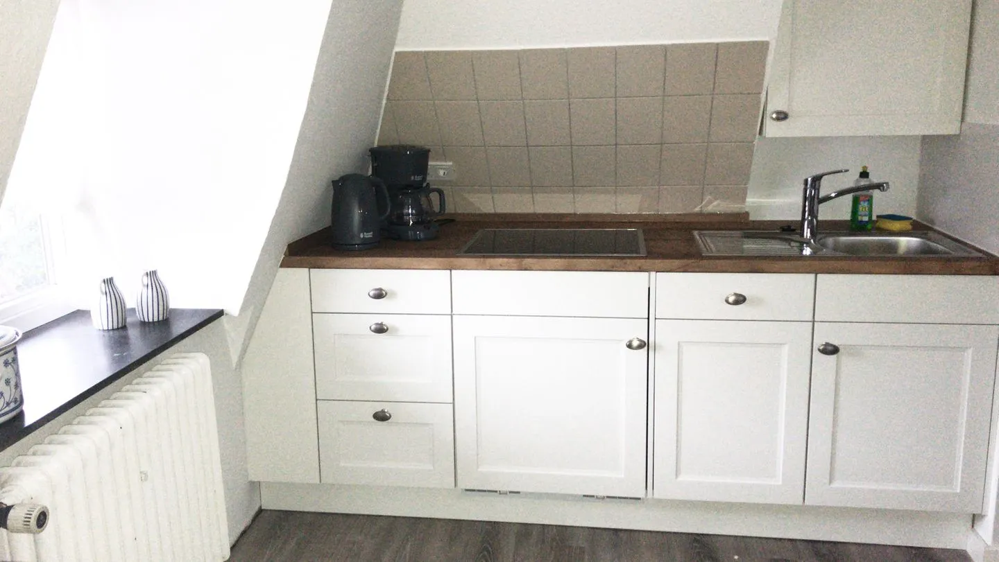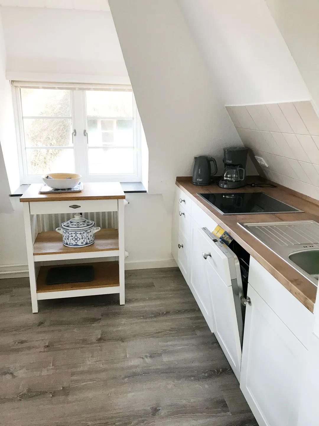 Küchenbereich mit 4-Platten-Ceranfeld, Spüle, Kühlschrank, Kaffeemaschine, Wasserkocher, Toaster, Geschirr und Hausrat für den täglichen Bedarf