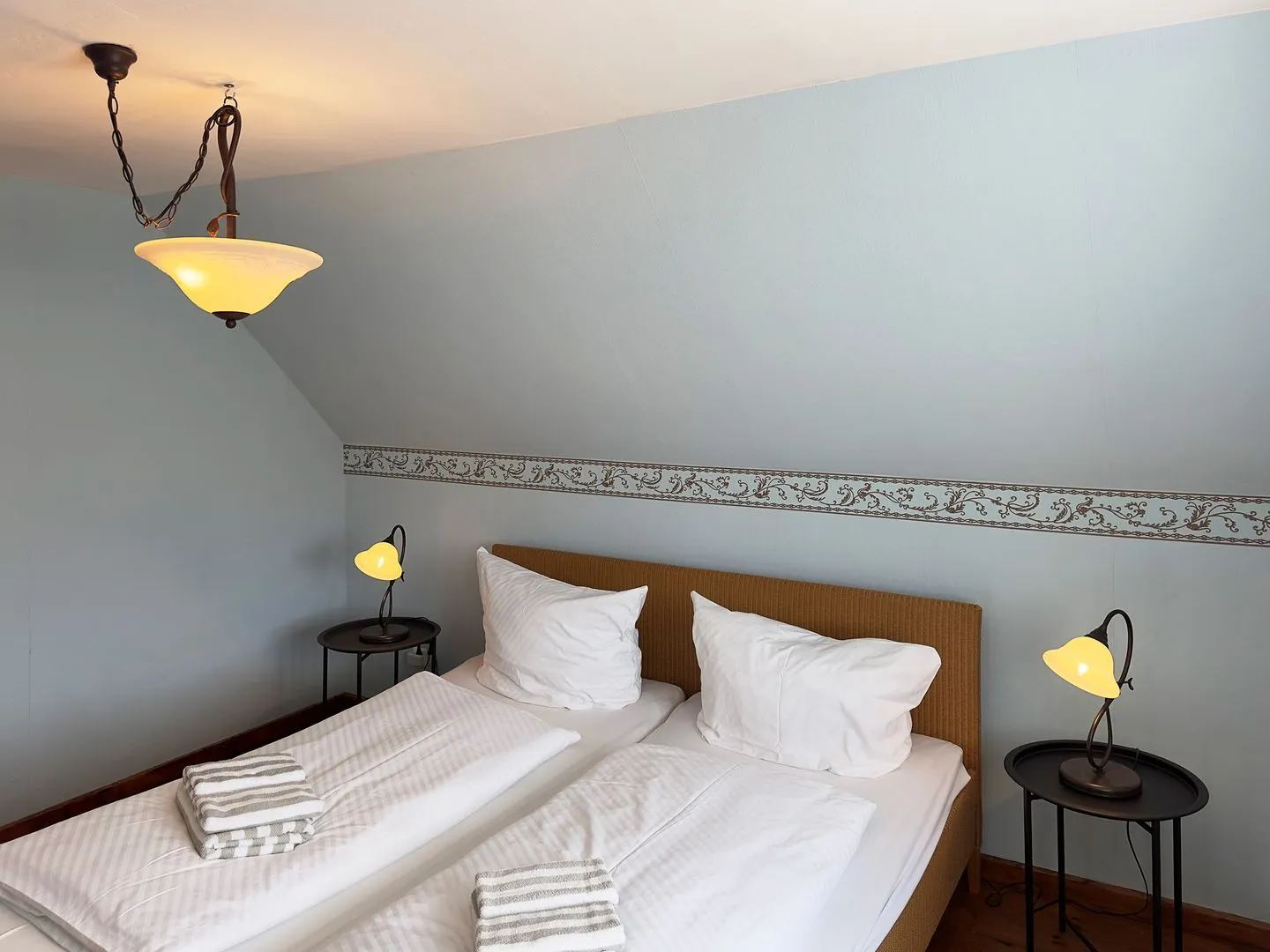 1x Schlafzimmer mit Doppelbett (180 x 200), Kleiderschrank, 2 Nachttischen, antiker Kommode und Stuhl als Leseplatz.
