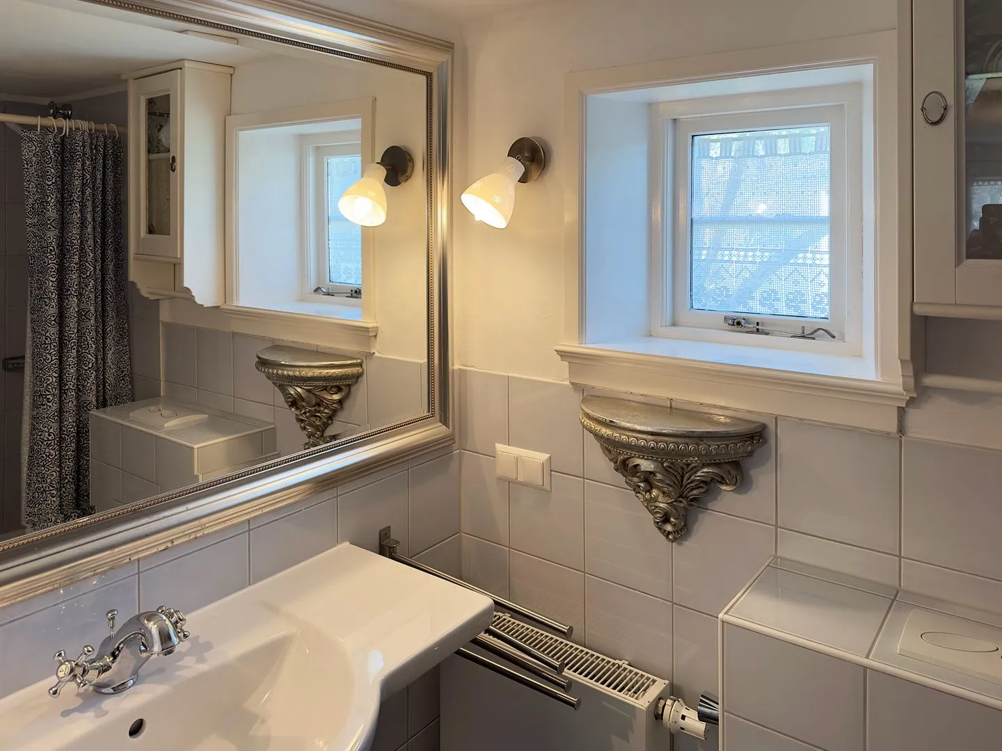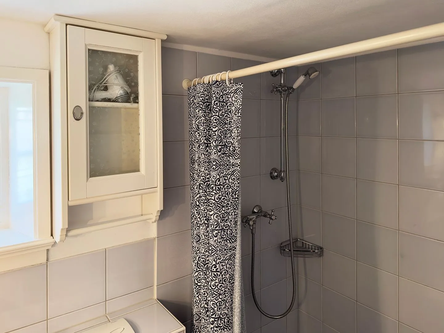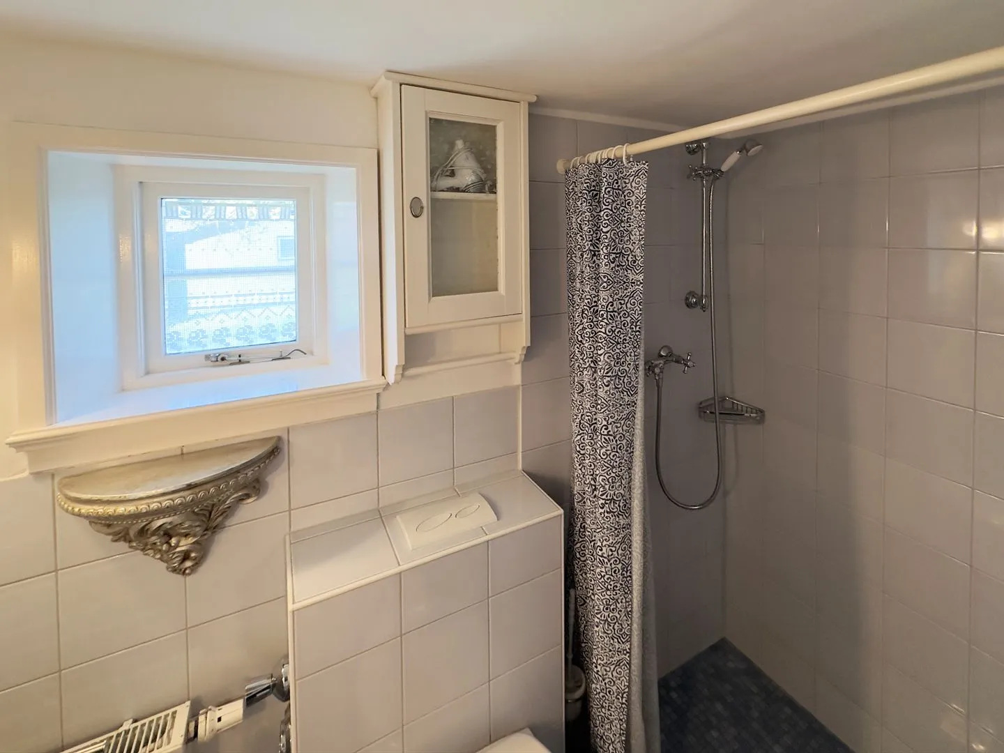 Badezimmer mit Dusche, Waschbecken, Badezimmerschrank und WC, Fön, Außenfenster