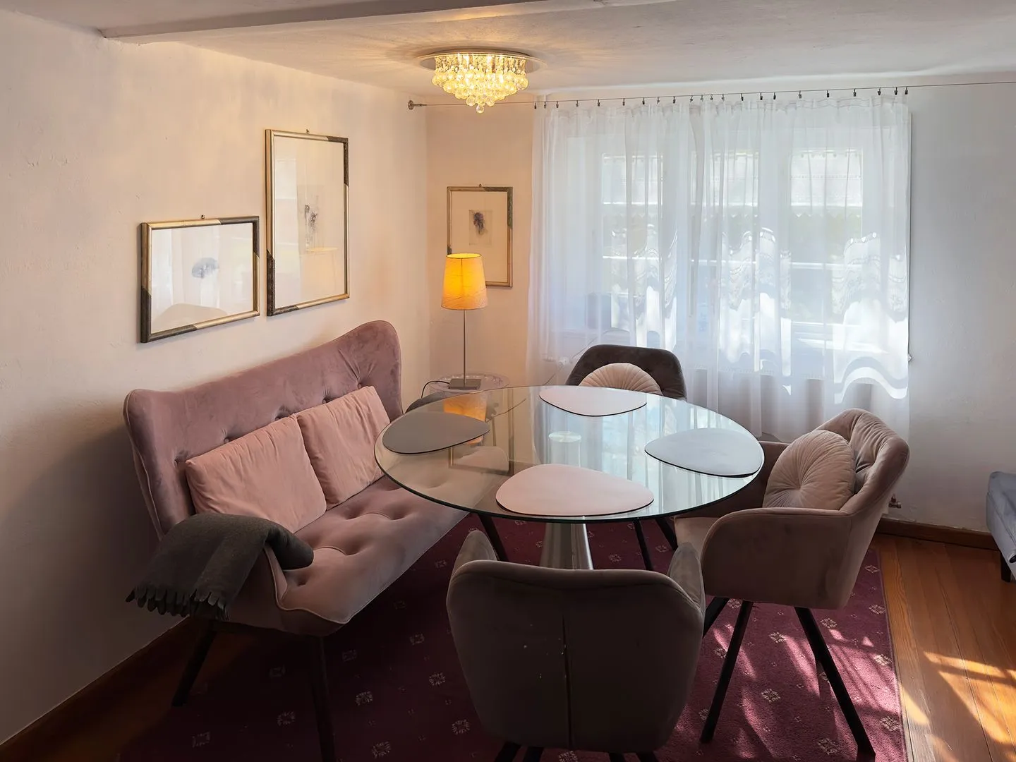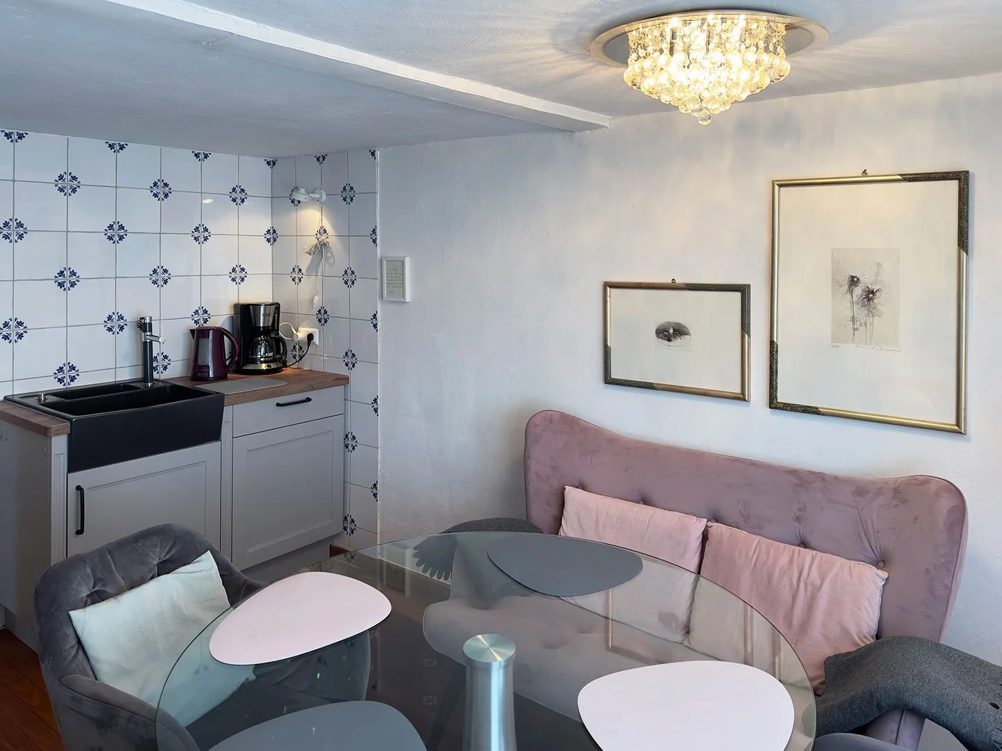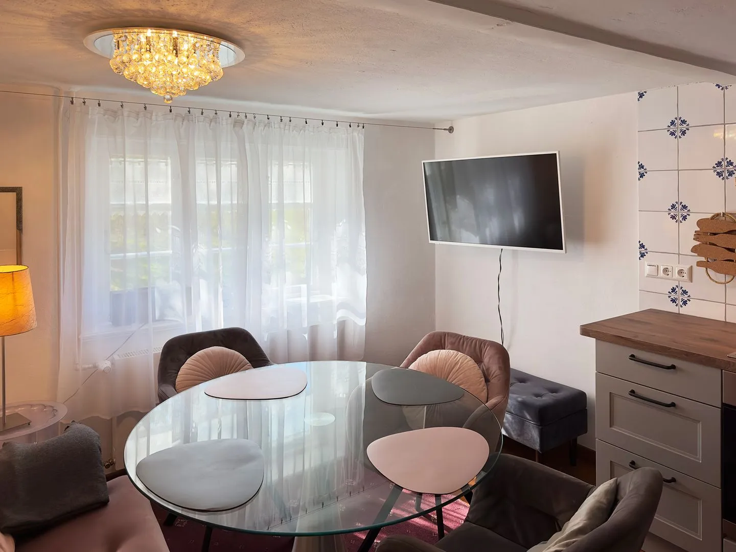 Wohnküche, antiker Esstisch, gemütliche Eckbank, 2 Freischwinger, TV, moderne Kücheneinrichtung