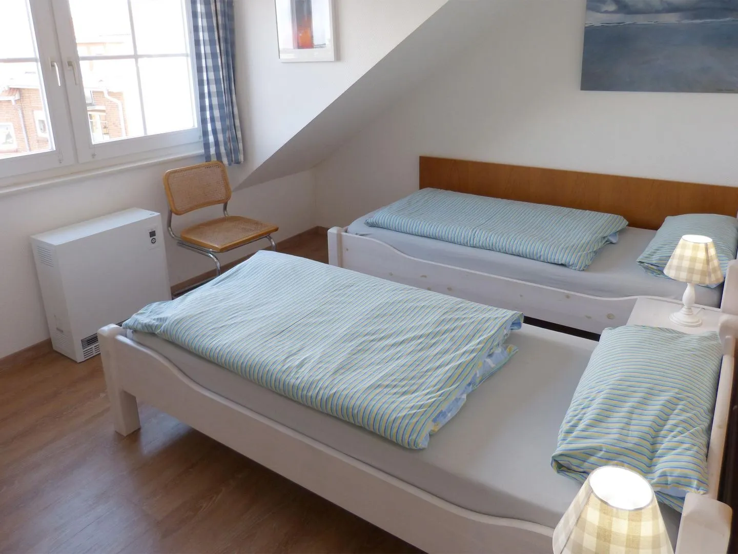 2 zusammenstellbare Einzelbetten (je 90x200), Nachttische, Kleiderschrank, Fenster mit Wattenblick, Laminatboden.