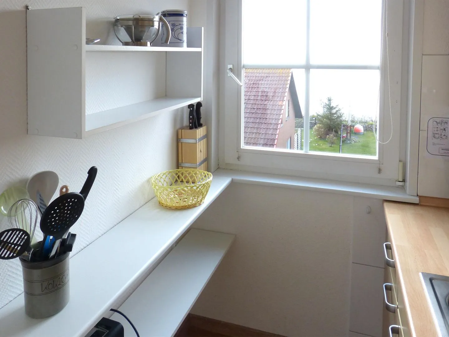 Küchenzeile mit Spüle, 4-Kochstellen, Backofen, Kühlschrank, Kaffeemaschine, Wasserkocher, Toaster sowie Geschirr und Hausrat für den täglichen Bedarf. Fenster mit Meerblick.