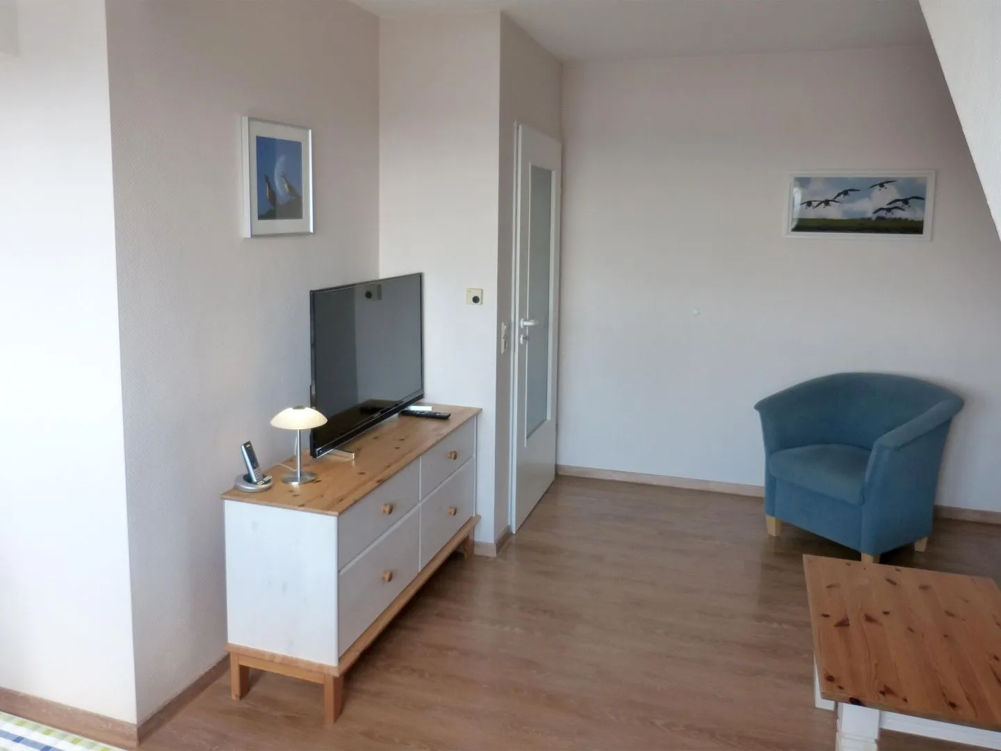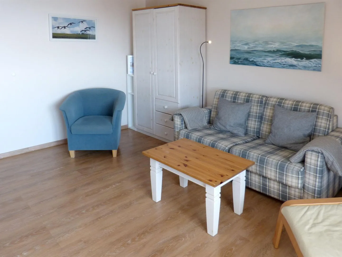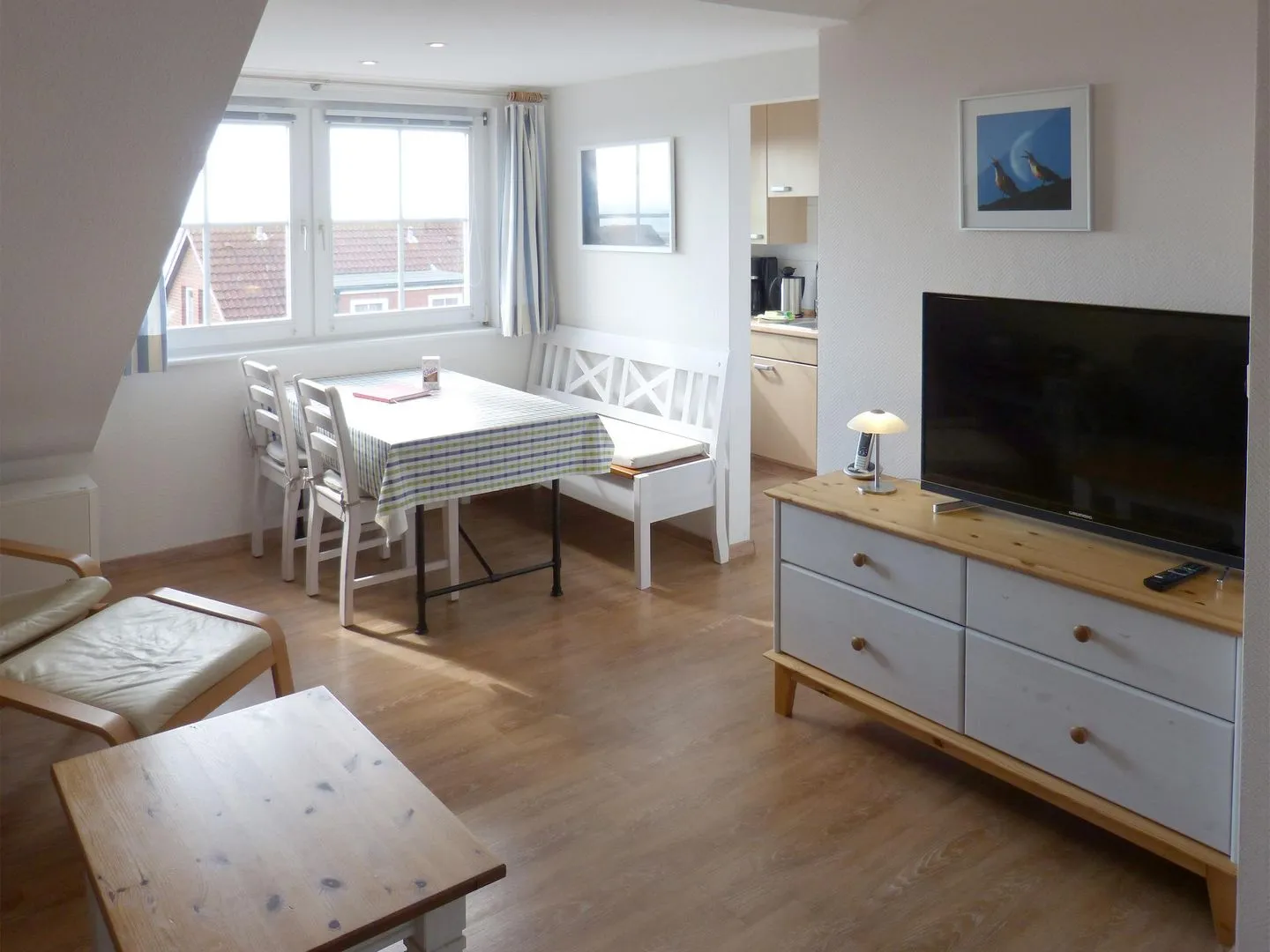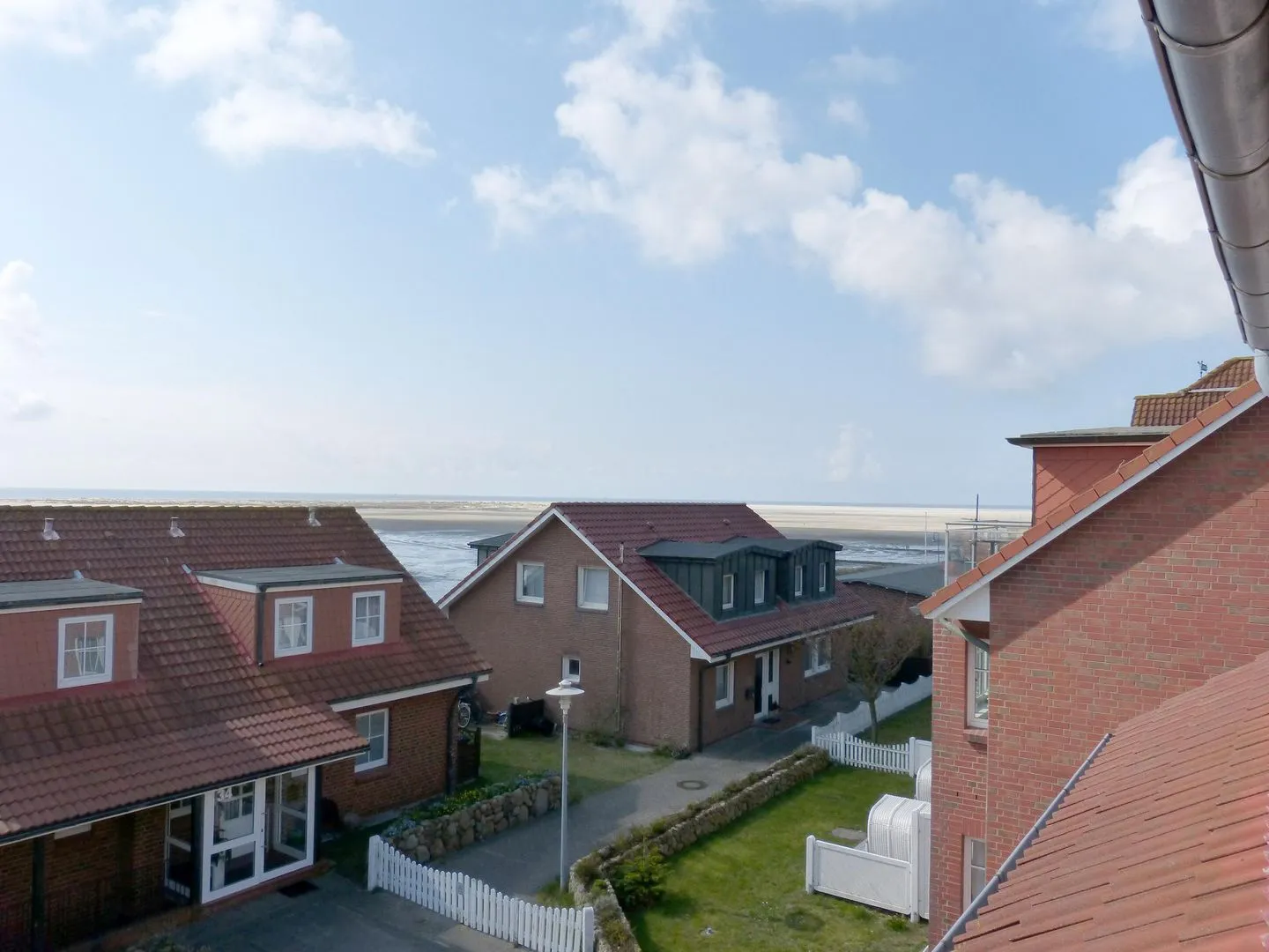 Fenster mit Blick auf Kniepsand und Nordsee bis zu den Halligen. Offener Durchgang zur Küche. Laminatbodenbelag.