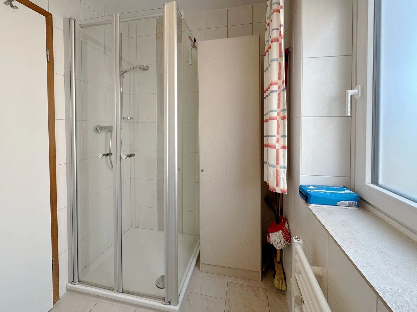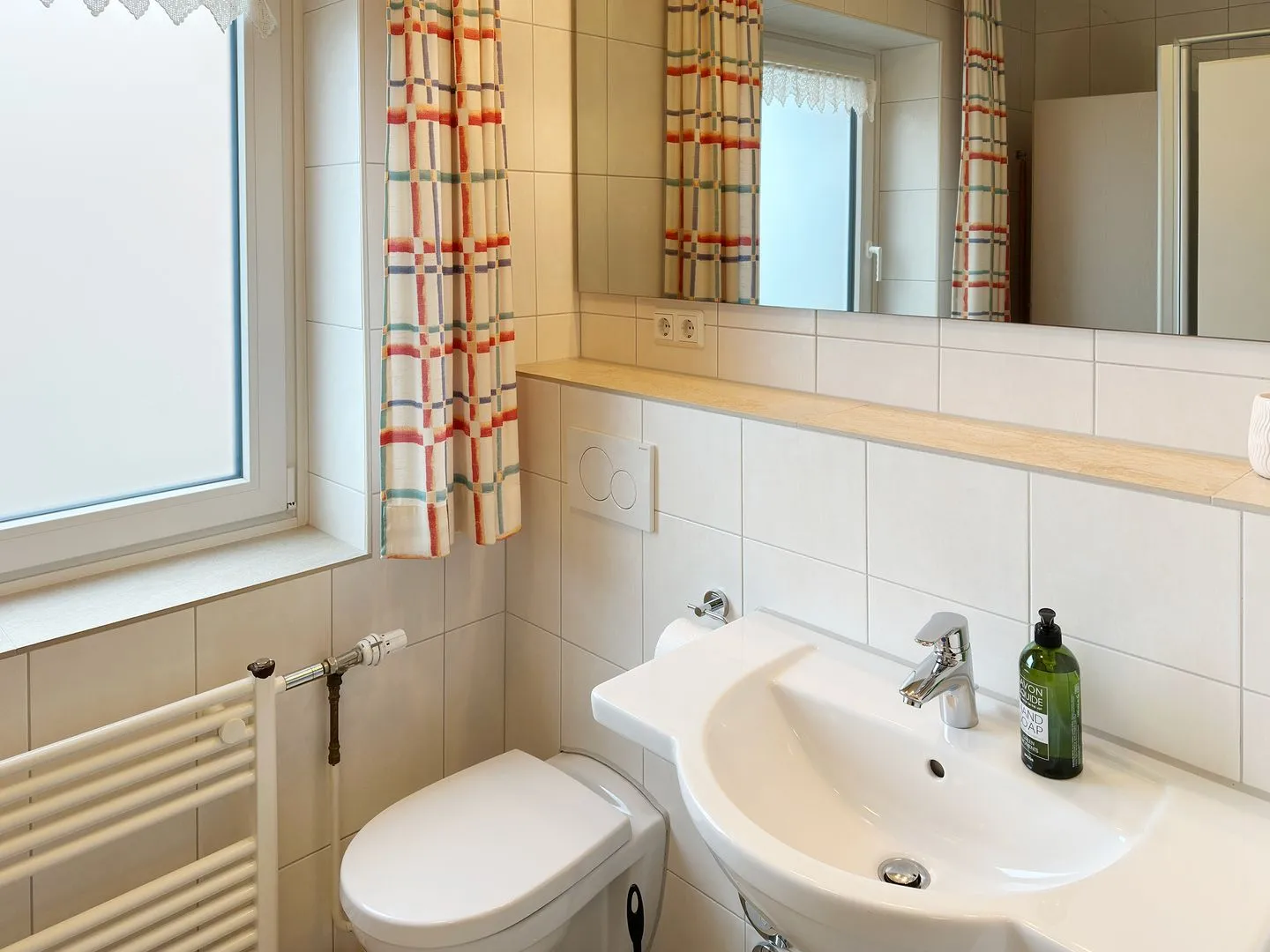 Badezimmer mit Dusche, WC, Waschbecken und Außenfenster