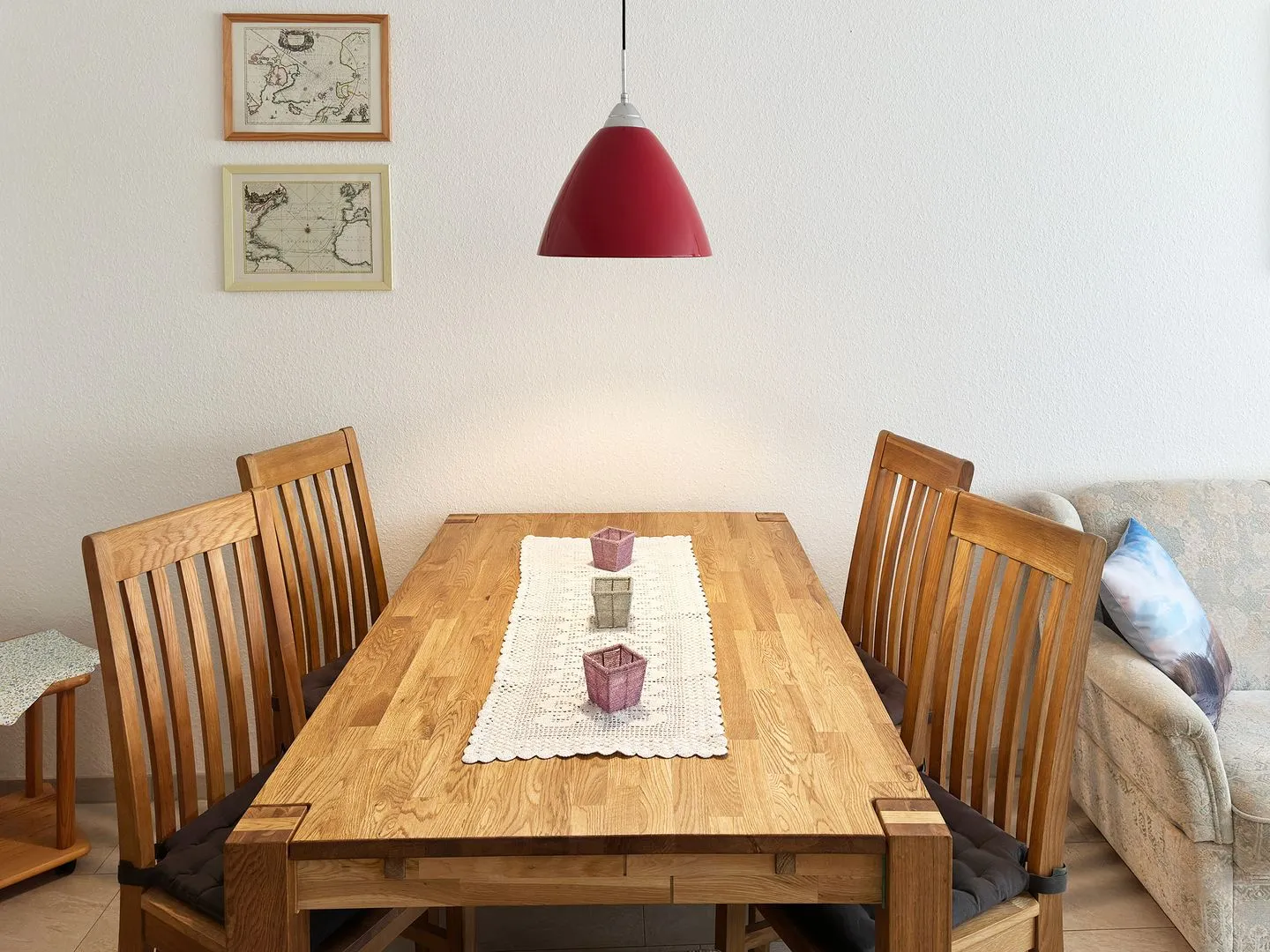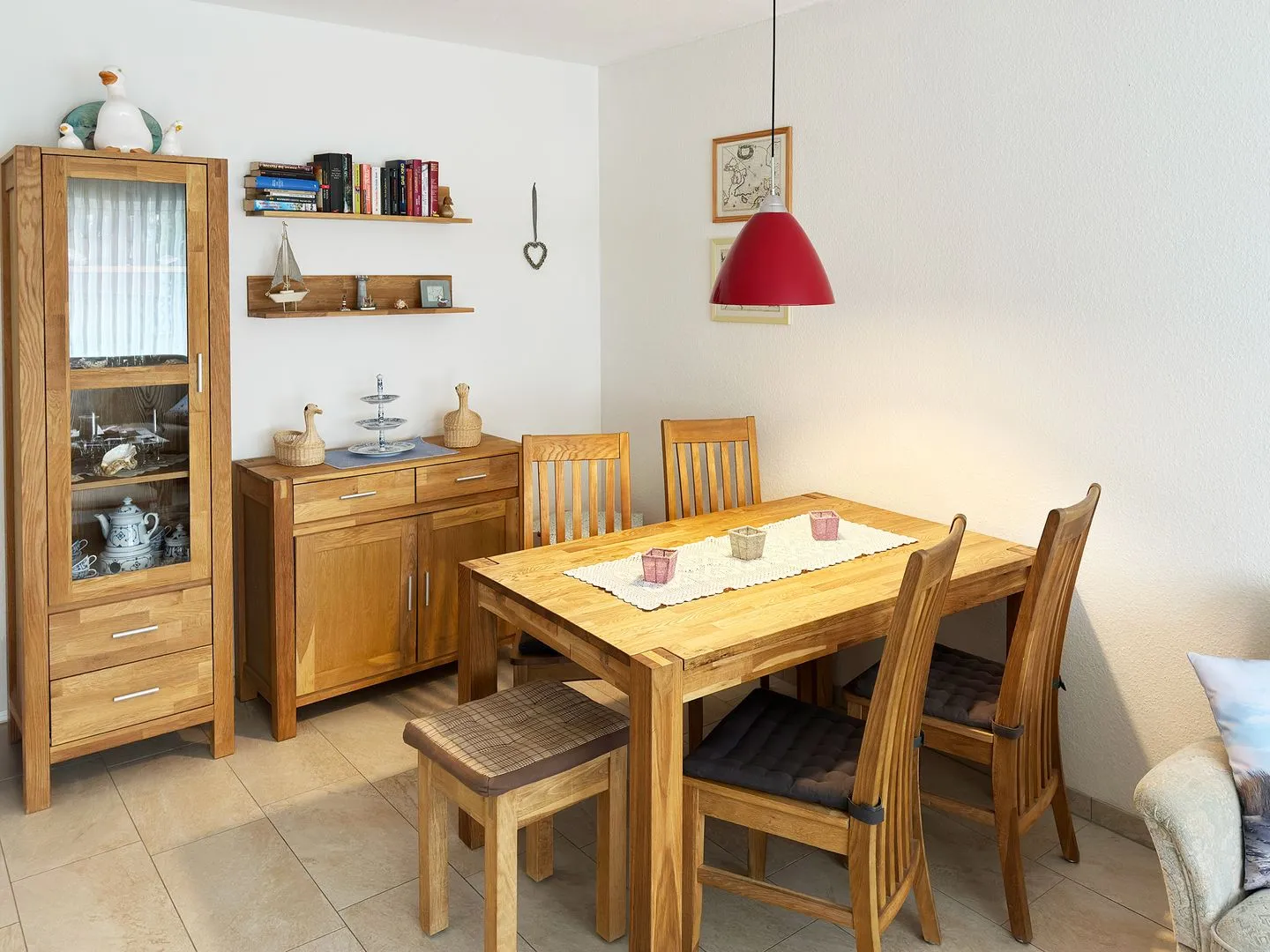 Wohnbereich mit Esstisch und 4 Stühlen, 2 separaten Schlafsofas (80 x 200), Couchtisch, Vitrinenschrank, Flachbild-TV, Sat-Receiver, Ausgang zur Süd-Terrasse mit Tisch/Stühlen (April-Oktober).