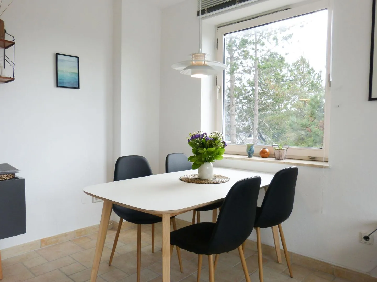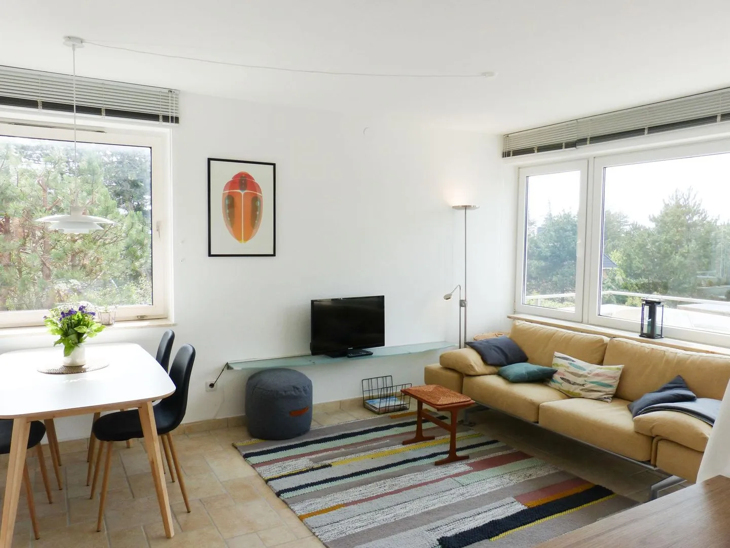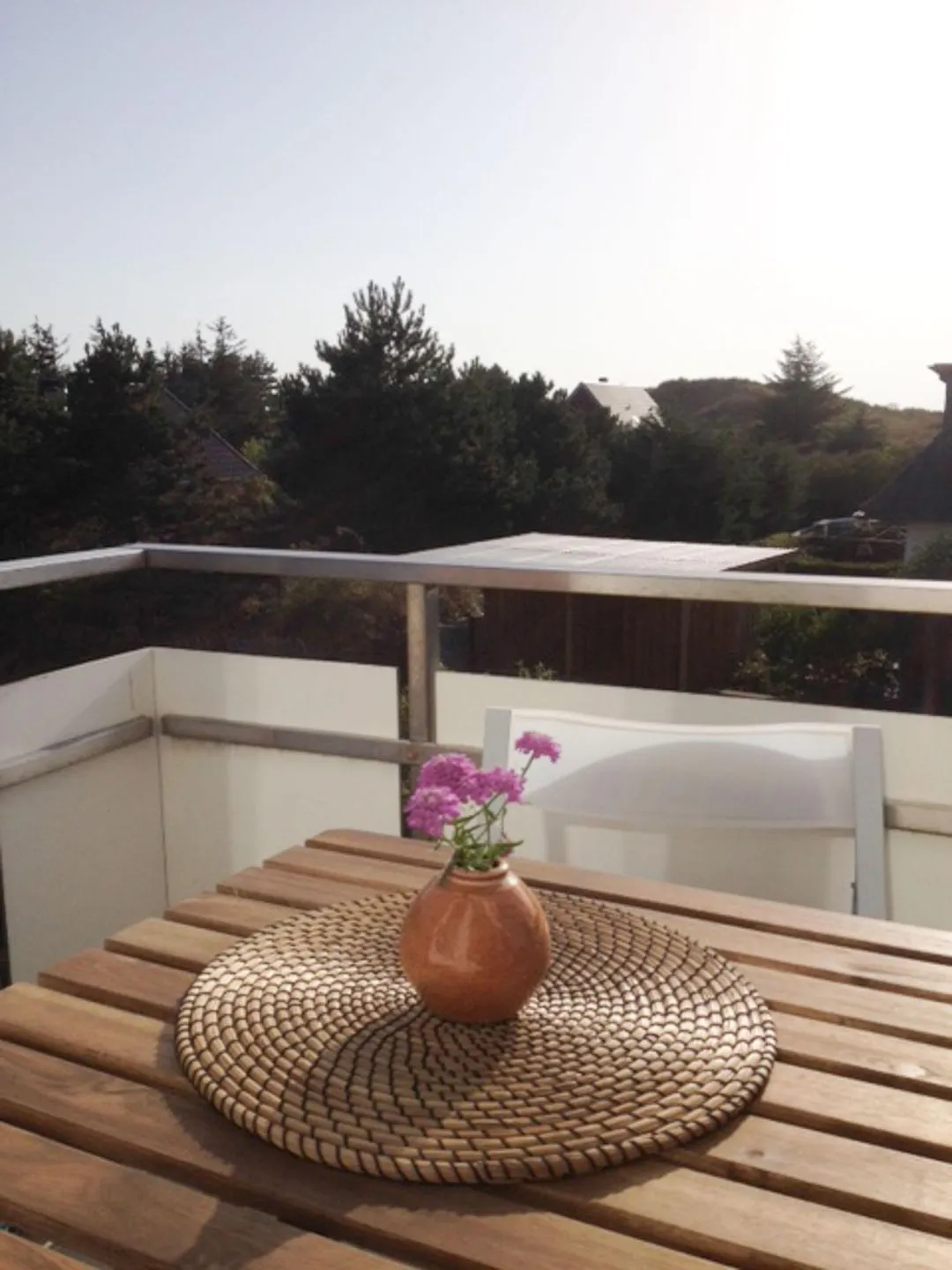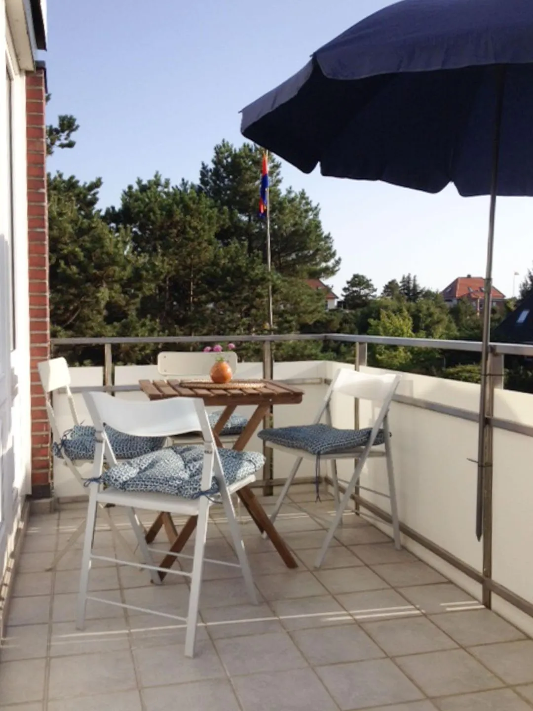 Die Wohnung verfügt über 1 Wohnraum mit WLAN, Sat-TV und offener Küche, 1 Schlafzimmer, 1 Badezimmer mit Dusche und WC; ein Süd-West-Balkon mit Gartenmöbeln (April bis Oktober) und Blick auf die Dünen, PKW-Stellplatz am Haus.