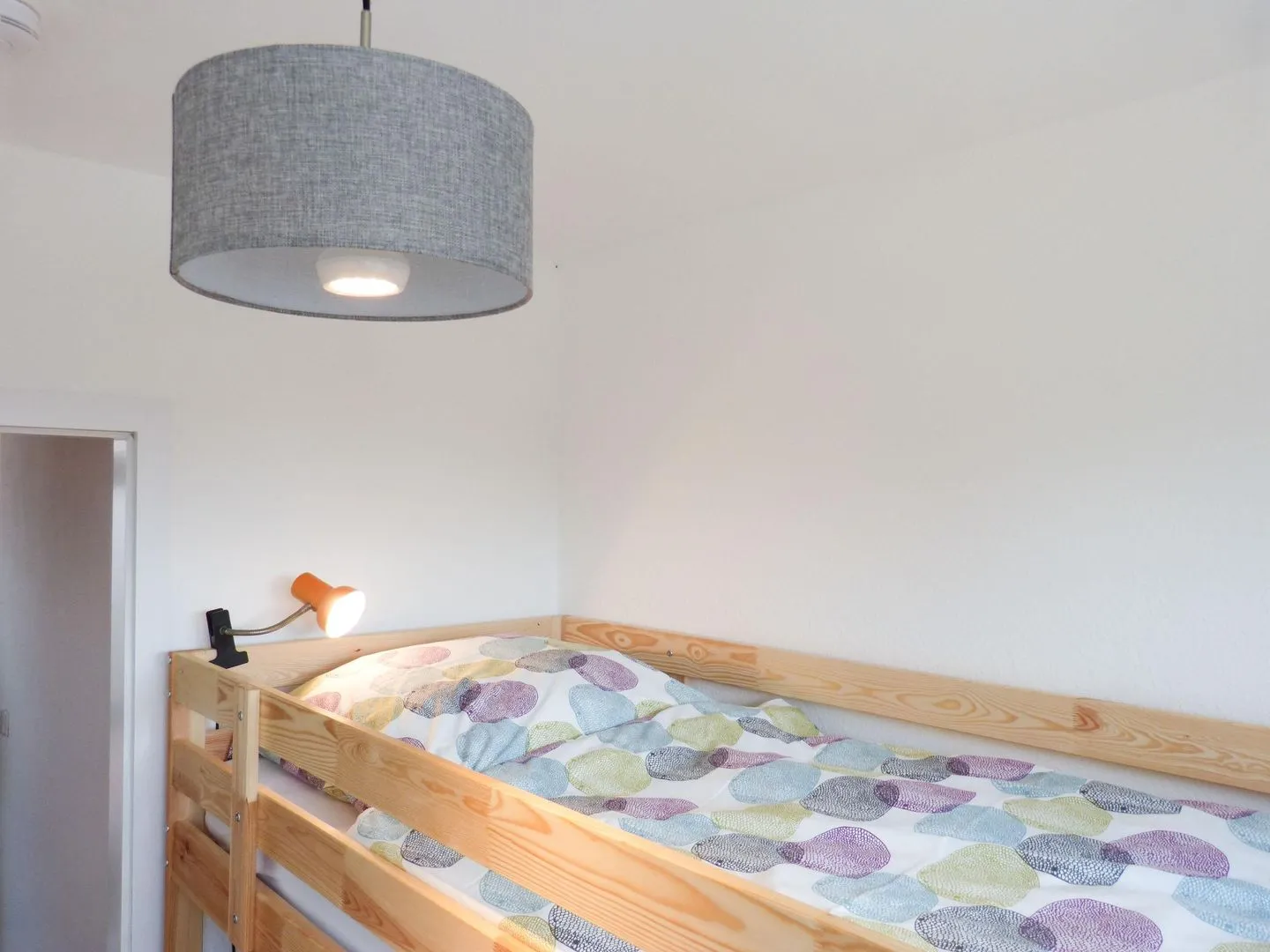 Schlafzimmer mit Doppelstockbett für 2 Personen (je 90cm x 100cm) kleine Kommode, CD, Kleiderschrank, schmales Fenster im oberen drittel der Außenwand.