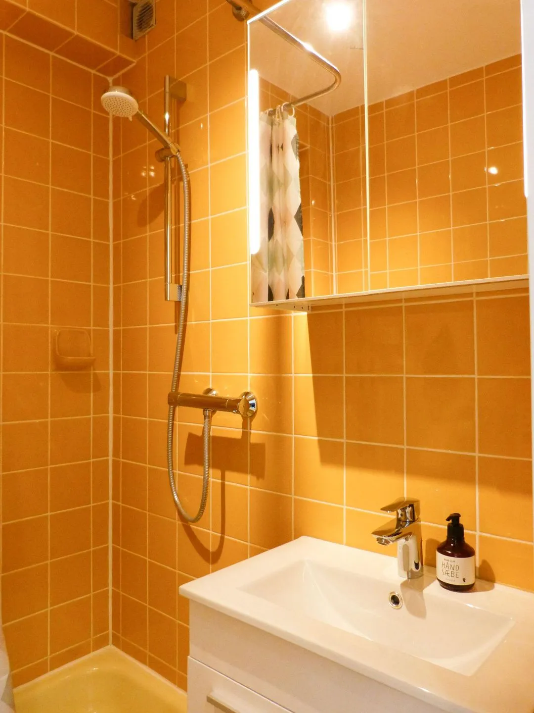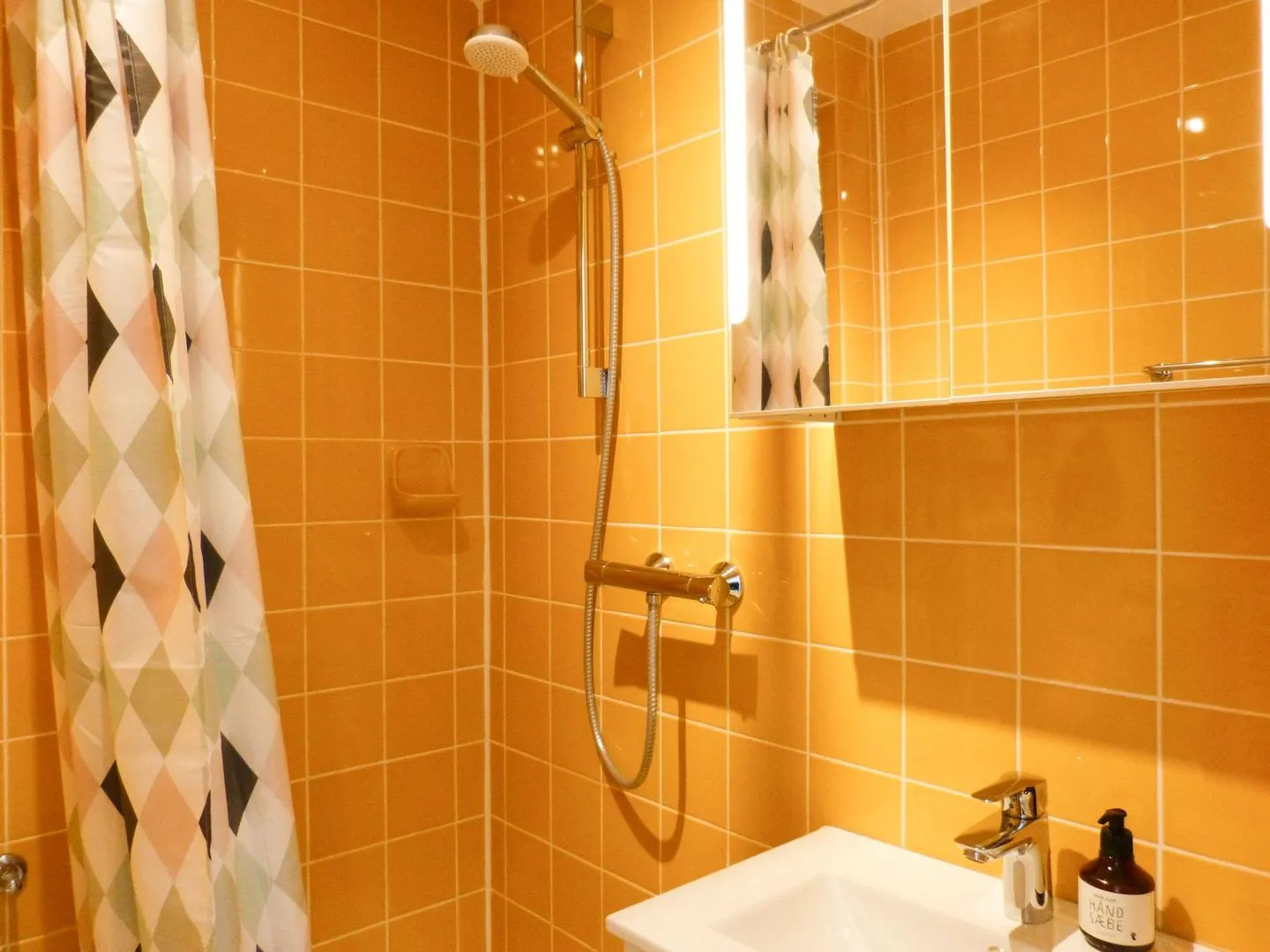Badezimmer mit Dusche, Waschbecken und WC. Fön.