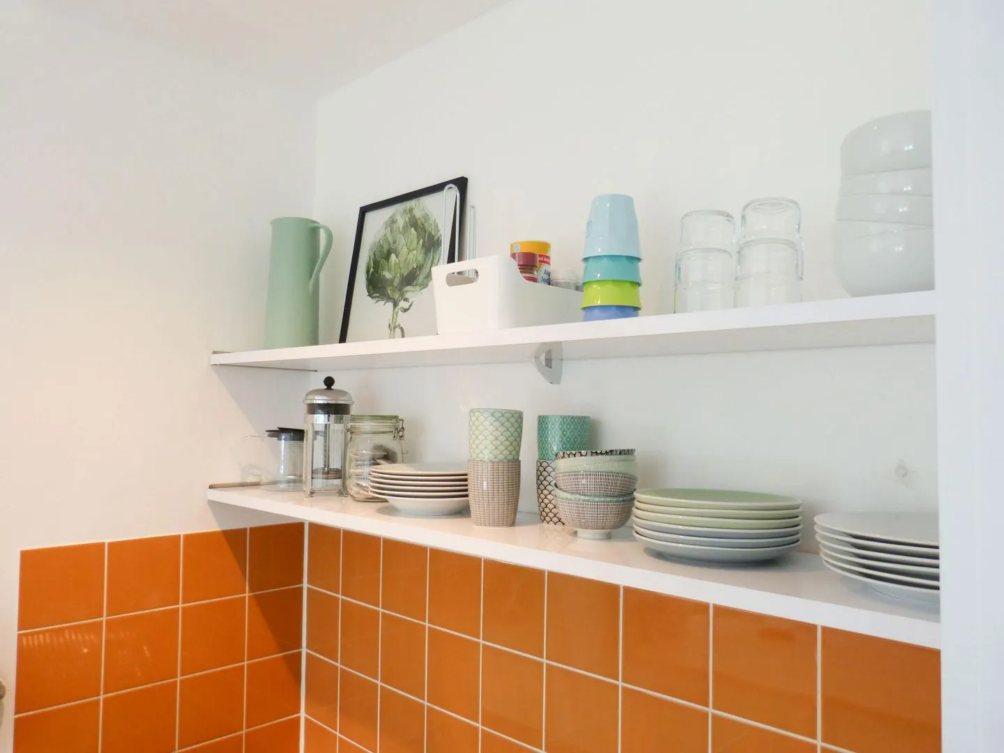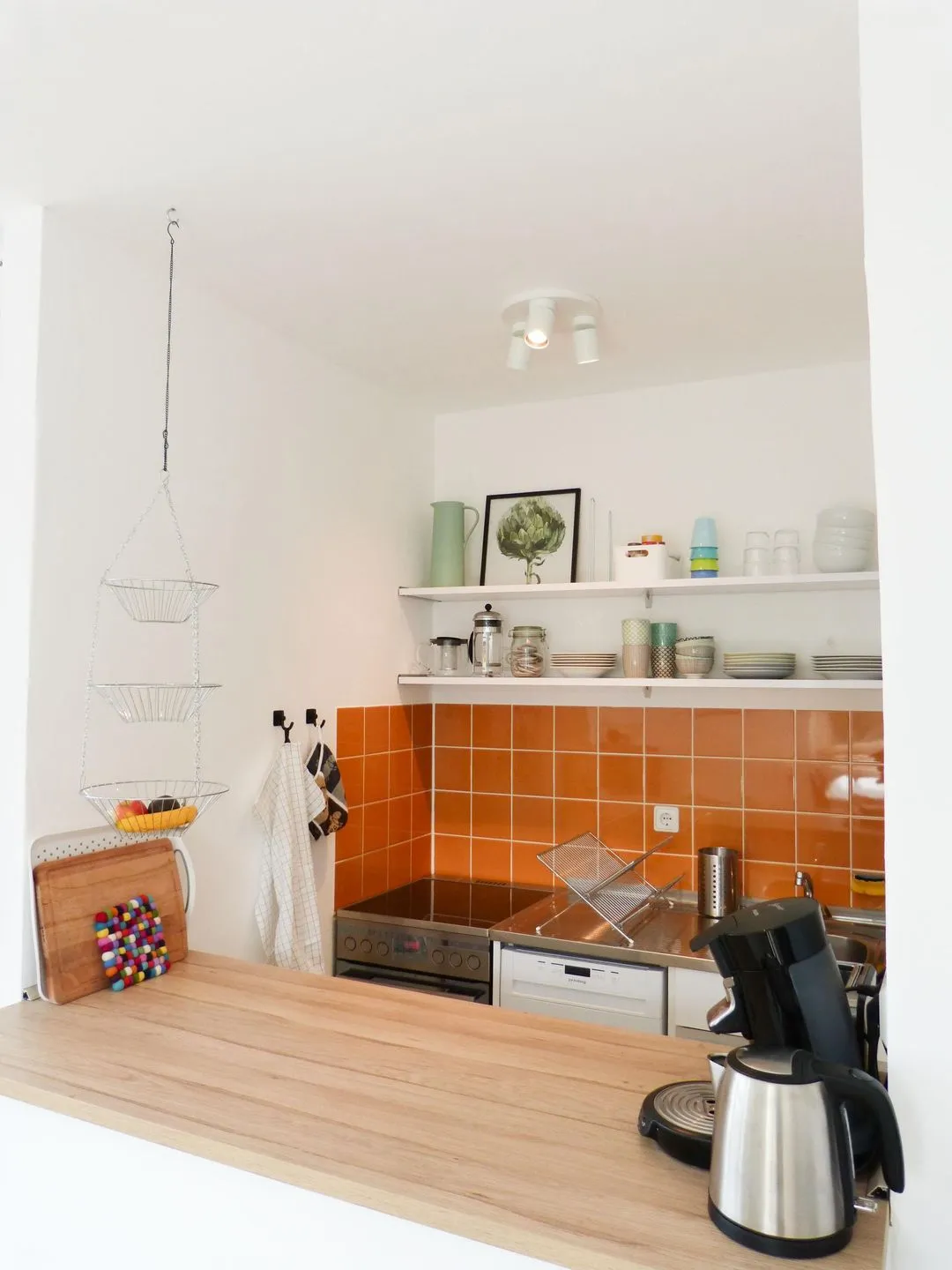 Die Küche ist ausgestattet mit einem Herd mit einem Ceranfeld, 4 Herdplatten, Backofen, Gerfrierfach im Kühlschrank, Geschirrspülmaschine, Senseo-Kaffeepad-Maschine, Filter-Kaffee-Maschine, Wasserkocher, Toaster sowie Geschirr und Hausrat für den täglichen Bedarf. Ein kleiner Küchentresen trennt den offenen Küchenbereich vom Wohnraum.