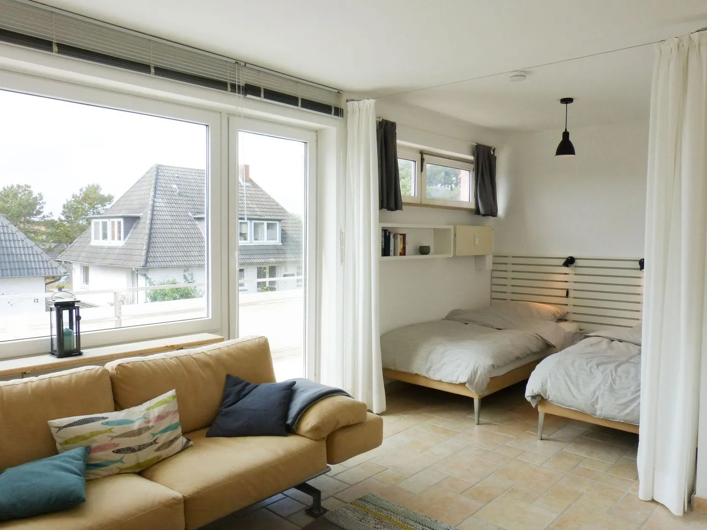 Großer, heller Wohnraum mit Fliesenboden. Wohnbereich mit Couch, Sideoard, TV, CD, WLAN. Ausgang zum großen Süd-WestBalkon mit Tisch und Stühlen (April - Oktober). Zum Wohnraum offene Schlafnische (abtrennbar durch zwei leichte Vorhänge) mit zwei zusammenstellbaren Einzelbetten (jeweils 90 cm x 200 cm), kleiner Nachttisch.