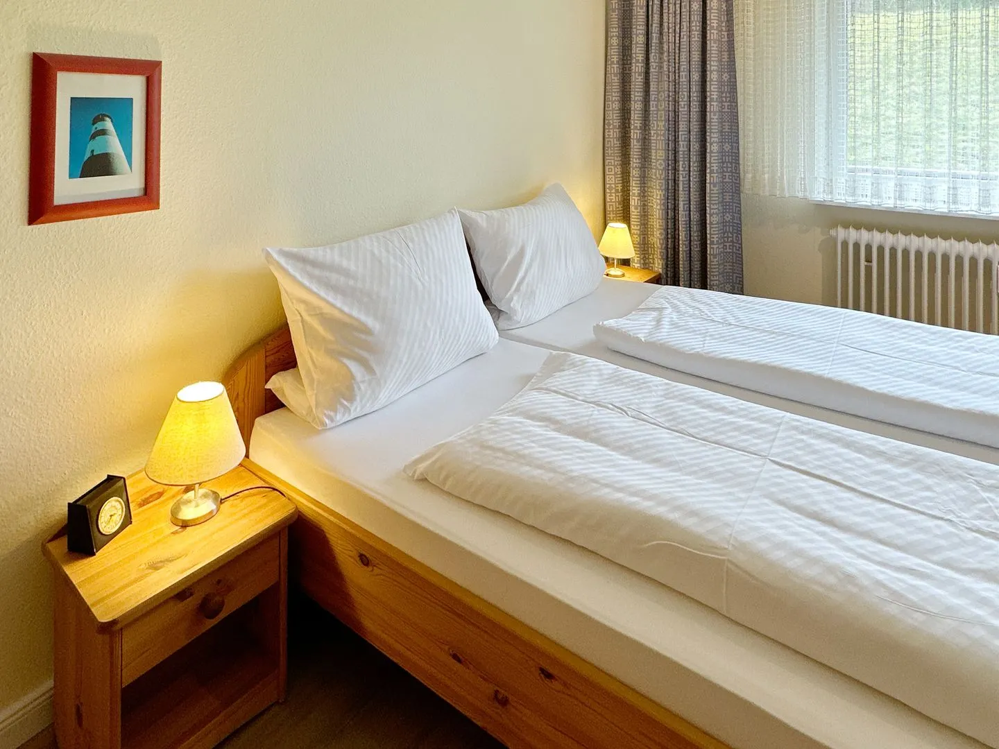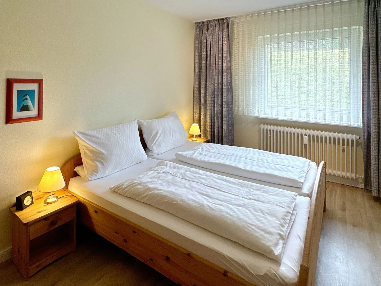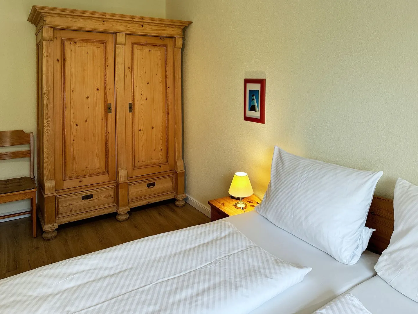 Schlafzimmer mit Doppelbett (2 x 90 x 200), 2 Nachttische, Kleiderschrank, 2 stumme Diener, Stuhl.