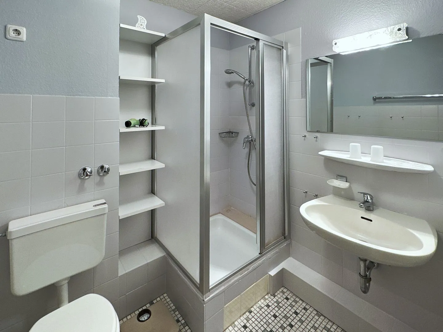 Badezimmer mit Dusche, Waschbecken und WC.